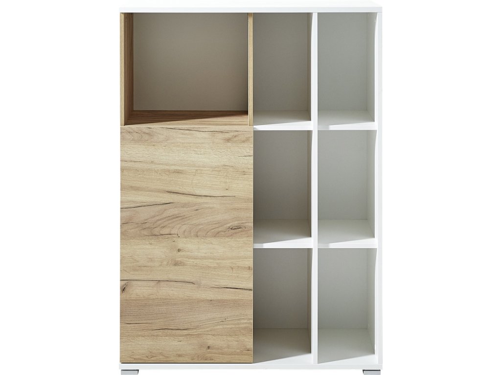 Vďaka svojmu dizajnu a farebnej kombinácii je knižnica 4195-513 Lioni ideálna na doplnenie inventára vašej kancelárie. Hodí sa k mnohým štýlom, a preto sa dá bez problémov integrovať do existujúcej kancelárie. Najmä vo vašej domácej pracovni ponúka knižnica optimálne riešenie z hľadiska priestoru a poriadku, pretože sedem otvorených a dve uzavreté priehradky za dvierkami ponúkajú dostatok úložného priestoru pre šanóny, knihy a iné pracovné materiály bez toho, aby kancelária vyzerala preplnená. Dvierka s technológiou push-to-open chránia dôverné dokumenty pred pohľadom, zatiaľ čo otvorené police umožňujú rýchly prístup k často používaným predmetom. Výhodou je i melamínový povrch knižnice, ktorý zvyšuje jej odolnosť voči poškriabaniu a umožňuje jednoduché odvádzanie vlhkosti.