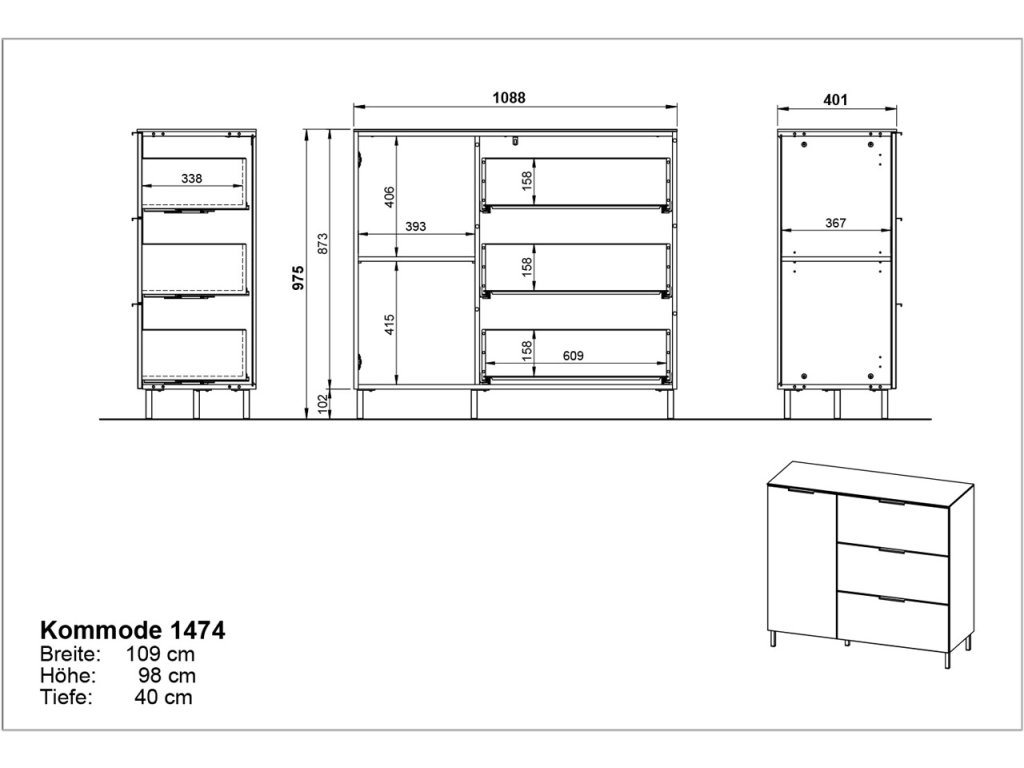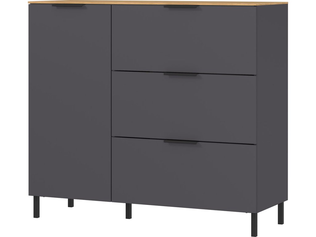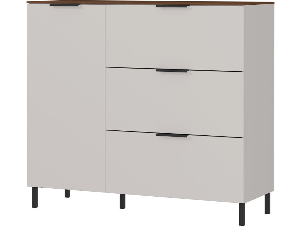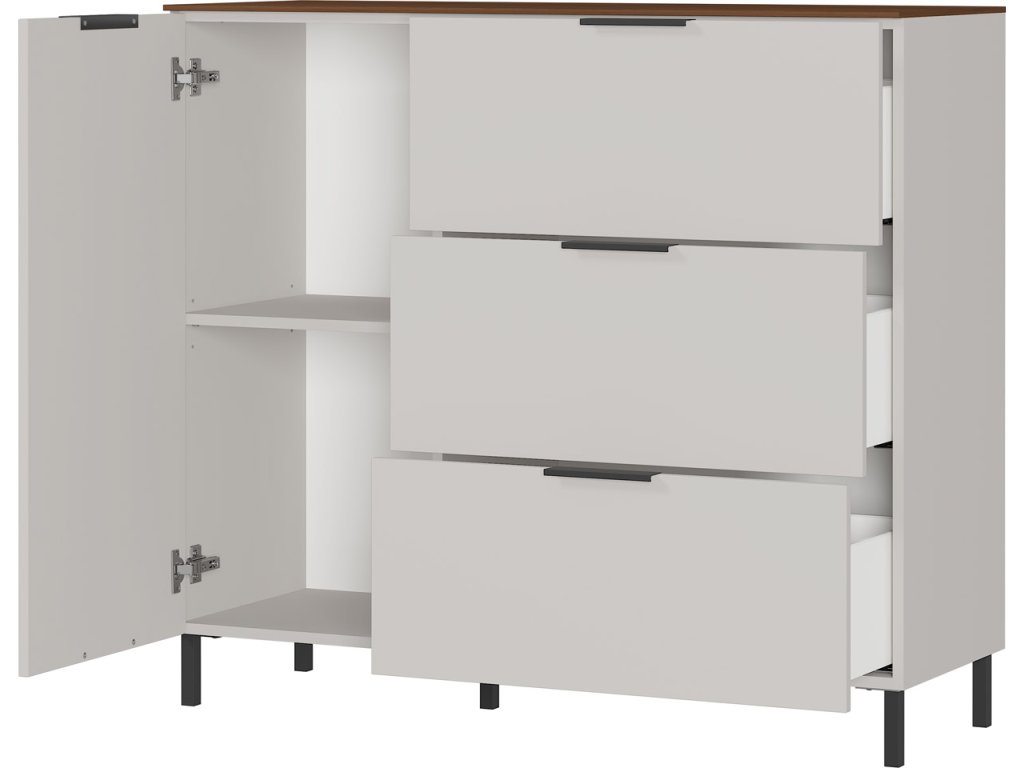 Vyobrazená komoda 1474 zo série California je vybavená dvierkami s tlmeným zatváraním a tromi zásuvkami s technológiou soft-close. Za dvierkami je polohovateľná polica. So šírkou 109 cm, výškou 98 cm (s vysokými kovovými nožičkami) a hĺbkou 40 cm ponúka dostatok úložného priestoru na riad alebo obrusy. Komoda sa dodáva buď v kašmírovom, teplom béžovom tóne, s vrchným panelom v dekore orecha (č. modelu 1474-573), v grafite kombinovanom s dekorom duba navarra (č. modelu 1474-549) alebo v bielej farbe s vrchnou doskou v dekore mramoru (č. modelu 1474-585).