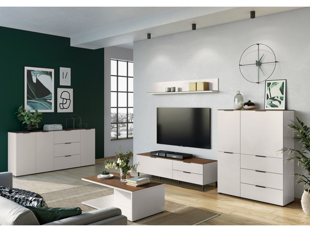 Obývačkový program California presvedčí elegantným dizajnom a premyslenou funkčnosťou. Vrchné panely s inovatívnym 8 mm dizajnom dodajú nábytku punc jedinečnosti. Rôzne komody, príborníky a TV stolíky, skrine, police a konferenčný stolík šikovne vylepšia každú miestnosť. Vysoké, štíhle nožičky z práškovo lakovaného kovu, ako aj kovové úchytky dodávajú nábytku moderný nádych. Všetky stojacie modely (s výnimkou konferenčného stolíka) je možné umiestniť na vysoké nohy aj na nábytkové klzáky, ktoré sú tiež súčasťou balenia.