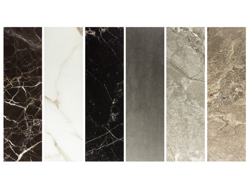 dosky stolov z vysoko kvalitného skla, dymového skla alebo keramiky sú štýlovo kombinované s elegantnými kovovými podnožami.
