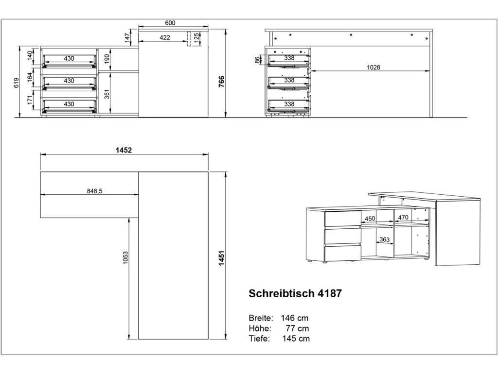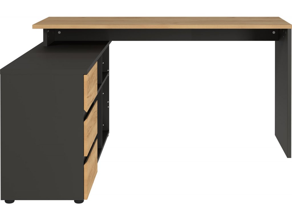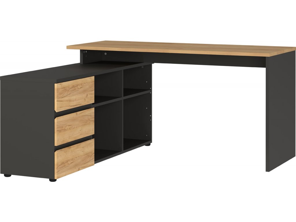 Písací stôl 4187 Lissabon v pútavom grafitovom prevedení kombinovanom s dekorom duba navarra premení vašu kanceláriu na úhľadný a útulný priestor. Vďaka integrovanej skrinke s tromi zásuvkami a štyrmi priehradkami budete mať všetky dokumenty, šanóny i kancelárske potreby nielen prehľadne usporiadané, ale i vždy poruke. Moderný vzhľad nábytku umocňuje nadčasový, bezúchytkový dizajn zásuviek. Kvalitu tohto kancelárskeho stola podtrhávajú ABS hrany, povrch z melamínovej živice a systém samozatvárania zásuviek.