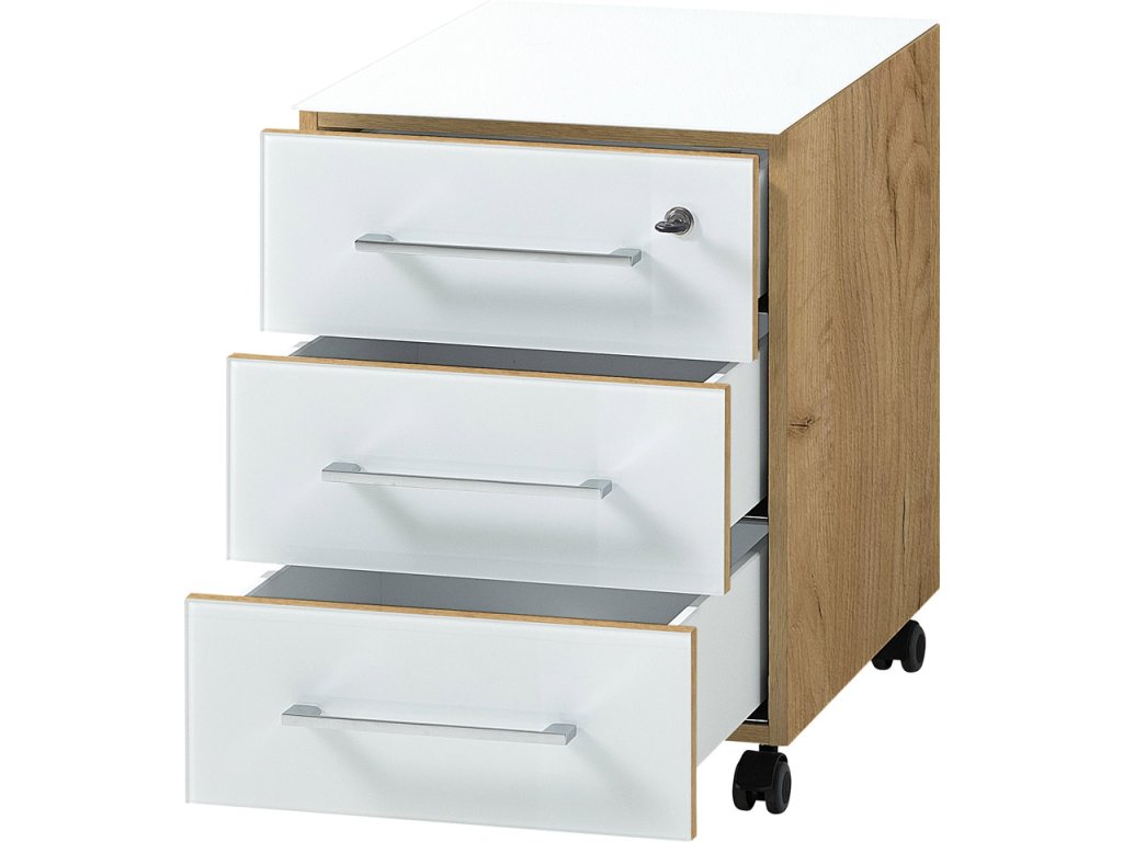 Elegantný pojazdný kontajner 4201 Monteria vytvára obdivuhodné akcenty v profesionálnych či domácich kanceláriách. Dostatok úložného priestoru na pracovisku poskytujú tri zásuvky, z ktorých jedna je uzamykateľná. Knihy, poznámky a písacie potreby tak môžu byť elegantne chránené pred zvedavými pohľadmi. Pojazdný kontajner má navyše uzamykateľné kolieska, ktoré podčiarkujú flexibilitu a mobilitu nábytku. Štýlové chrómové úchytky dodávajú pojazdnému kontajneru nielen štýlový vzhľad, ale disponujú aj veľkou úchopovou plochou, ktorá uľahčuje otváranie jednotlivých zásuviek. Všetky zásuvky sú vybavené aj integrovaným samozatváracím mechanizmom.