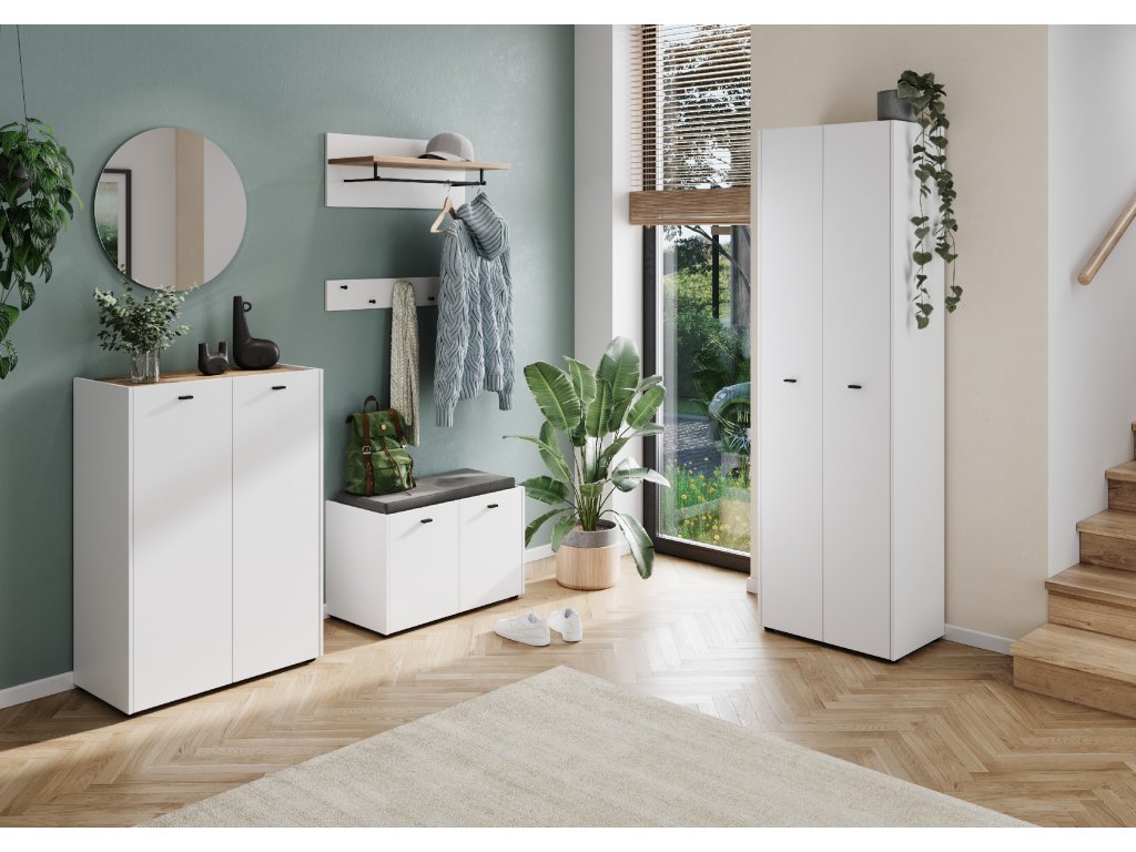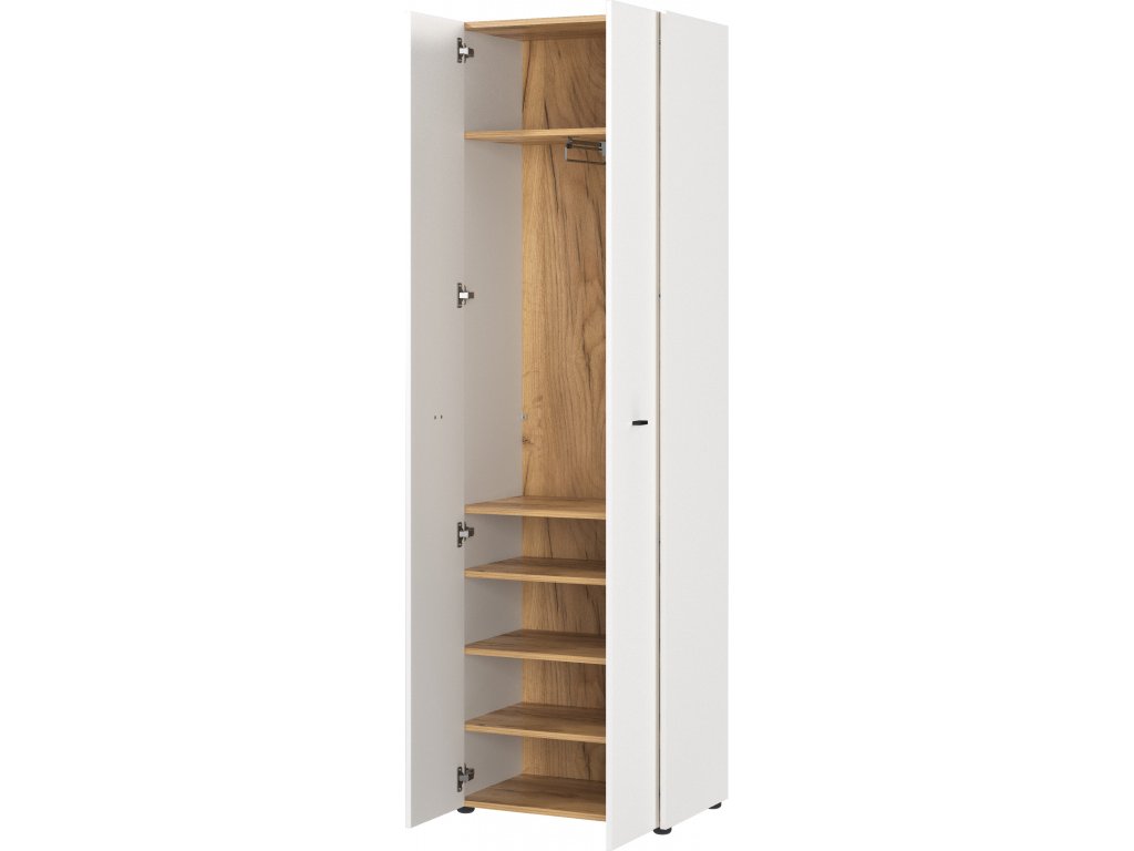 S rozmermi 59 x 198 x 40 cm (Š x V x H) je skriňa perfektným doplnkom k vešiakovej stene 2126 a skrinke na topánky 2125 z rovnakej série. Vďaka povrchu z melamínovej živice je nábytok robustný, nárazuvzdorný a odolný voči vlhkosti. Za dvojkrídlovými dverami šatníkovej skrine sa nachádza štyri polohovateľné police. Tie ponúkajú priestor pre rôzne pokrývky hlavy, oblečenie, obuv a ďalšie doplnky. Dvere sú navyše vybavené integrovaným tlmením, ktorý umožňuje ich jemné zatváranie. Výsuvná tyč na šaty poskytuje ďalší úložný priestor.