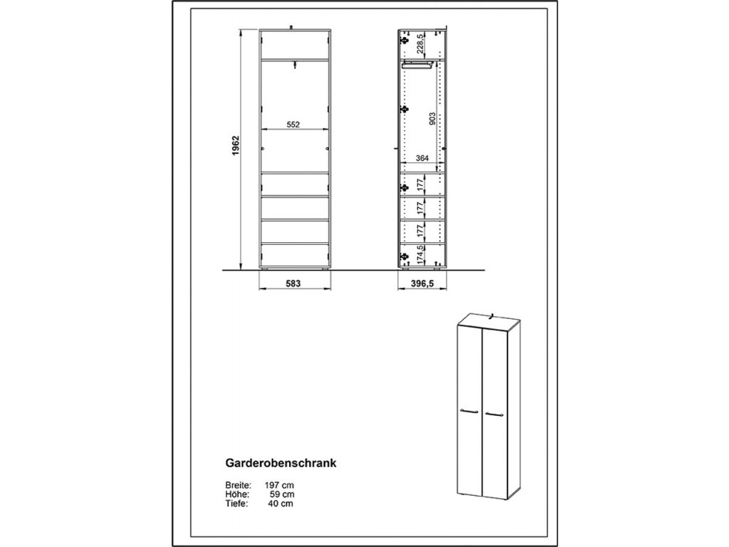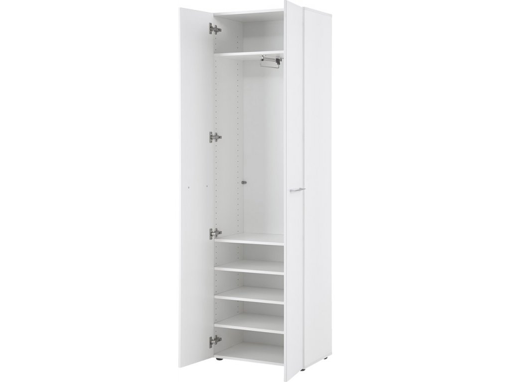 Skriňa má rozmery 59 x 197 x 40 cm (Š x V x H). Za dvojitými dvierkami sa nachádza päť nastaviteľných políc a výsuvná tyč na šaty. Tieto ponúkajú dostatok úložného priestoru pre vaše bundy, kabáty, oblečenie a ďalšie doplnky.