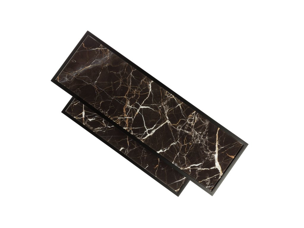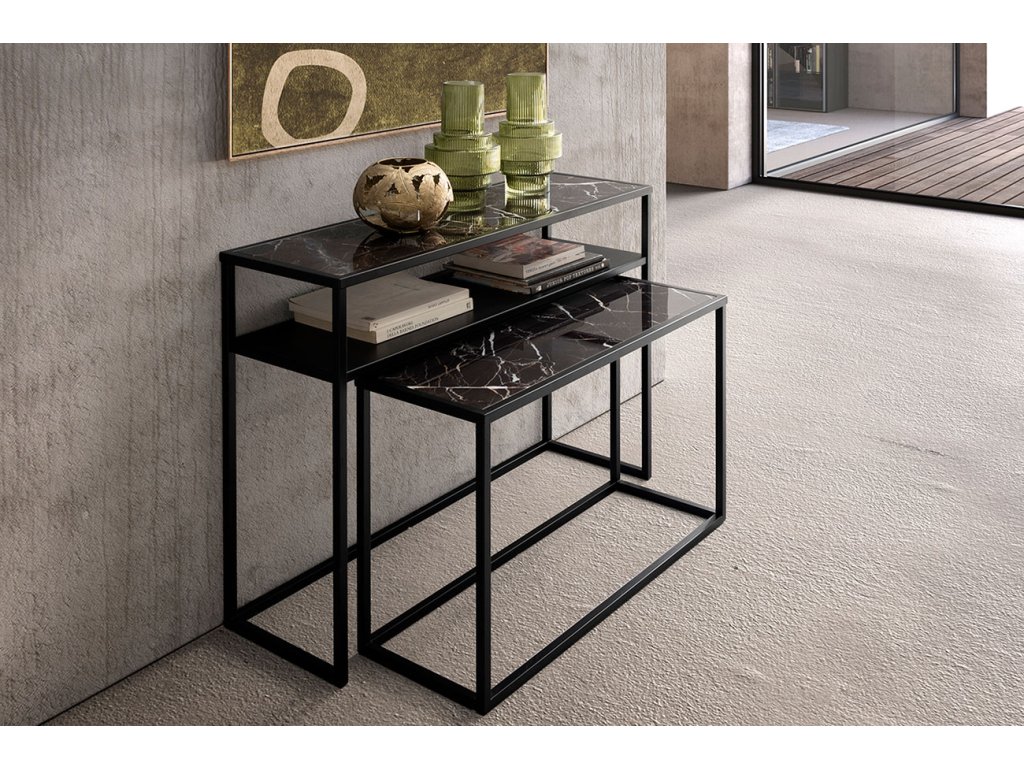dosky stolov z vysoko kvalitného skla, dymového skla alebo keramiky sú štýlovo kombinované s elegantnými kovovými podnožami.