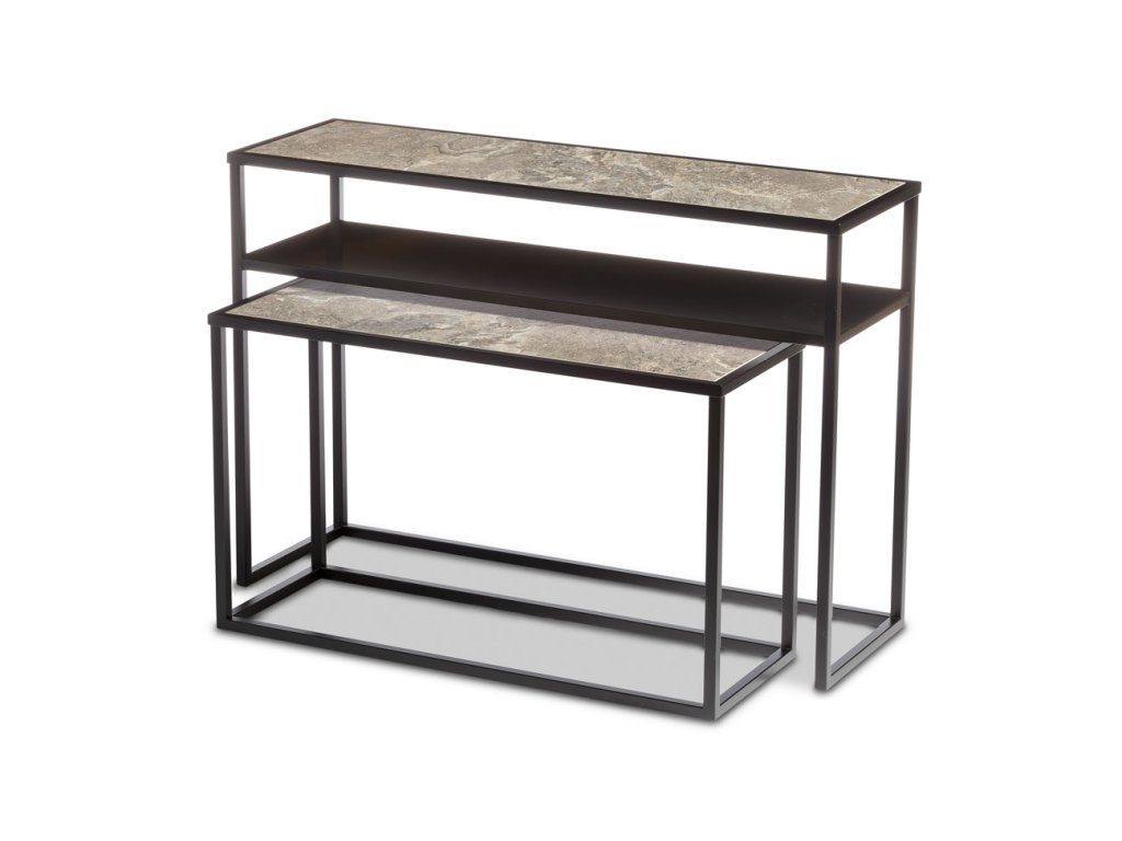 dosky stolov z vysoko kvalitného skla, dymového skla alebo keramiky sú štýlovo kombinované s elegantnými kovovými podnožami.