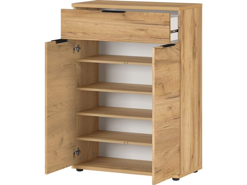 Skrinka na topánky 2790-243 Fremont je vybavená zásuvkou a dvomi dvierkami. Za dvomi dvierkami sú štyri police, z toho tri nastaviteľné. Do nábytku je možné uložiť až 16 párov topánok.